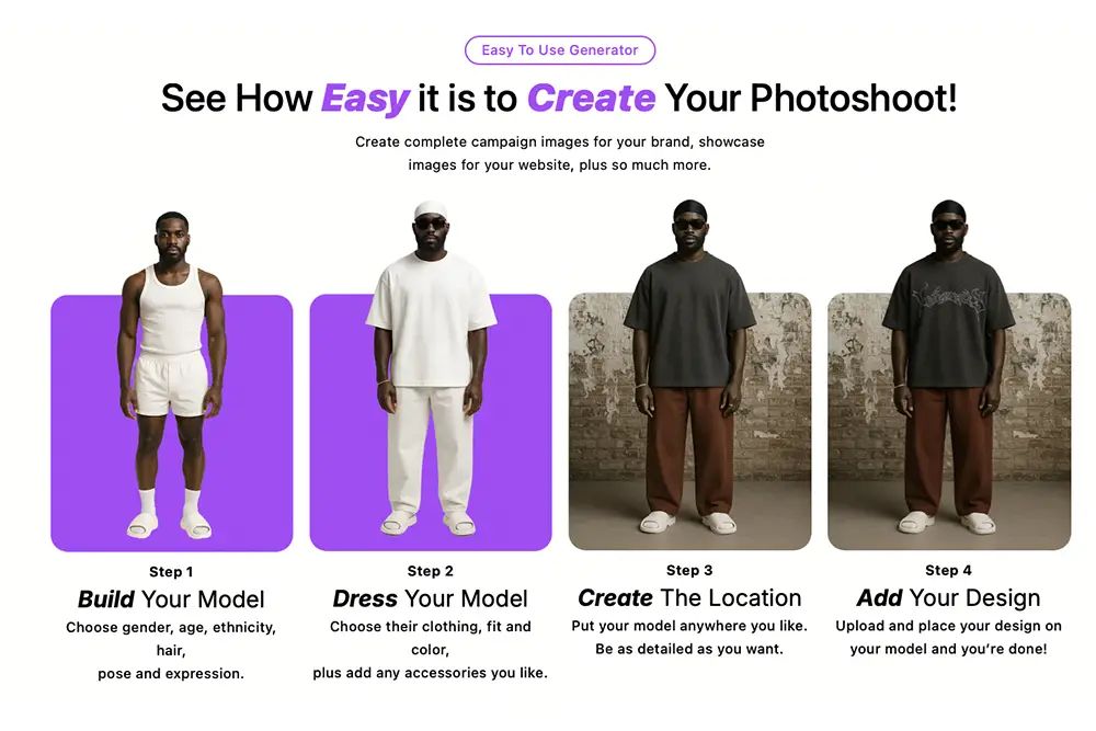 AI photoshoot technology makes it incredibly easy to turn your clothing designs into professional, polished marketing visuals. The process is quick – perfect for small brands – and involves just four simple steps. Here’s how it works: