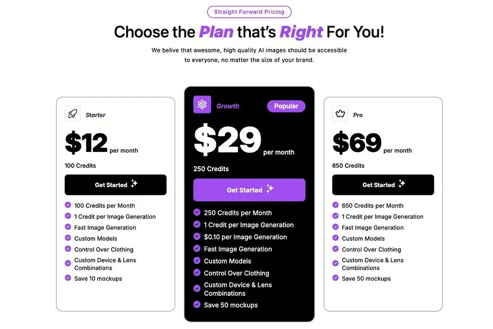 - Growth Plan: $29/month for 250 credits – perfect for seasonal collections or regular social media updates.