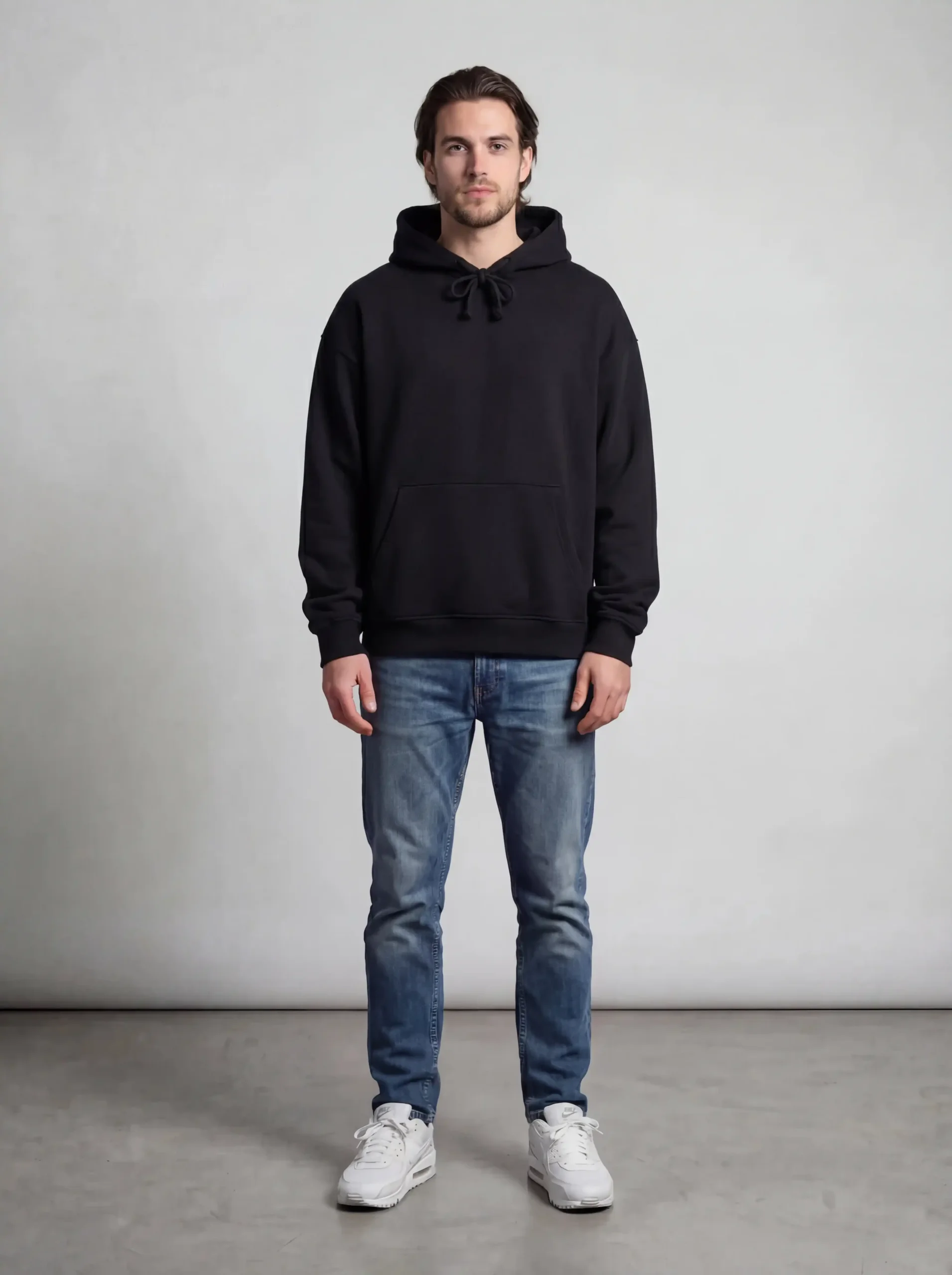 The fit showcases the drape and structure of the Hoodie cleanly, with Jeans rounding out a complete men Studio lookbook outfit. Shot in Studio lookbook style, the high-contrast result works directly on Shopify product pages, Instagram posts, print-on-demand listings, and fashion lookbooks, no editing required.