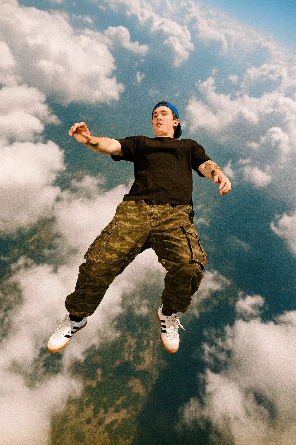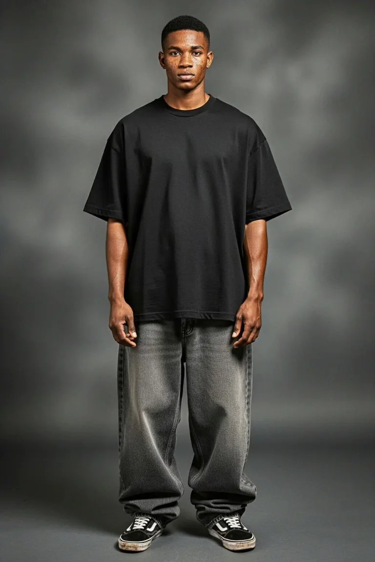 A high-contrast AI person clothing mockup built for editorial product listings and lookbooks.