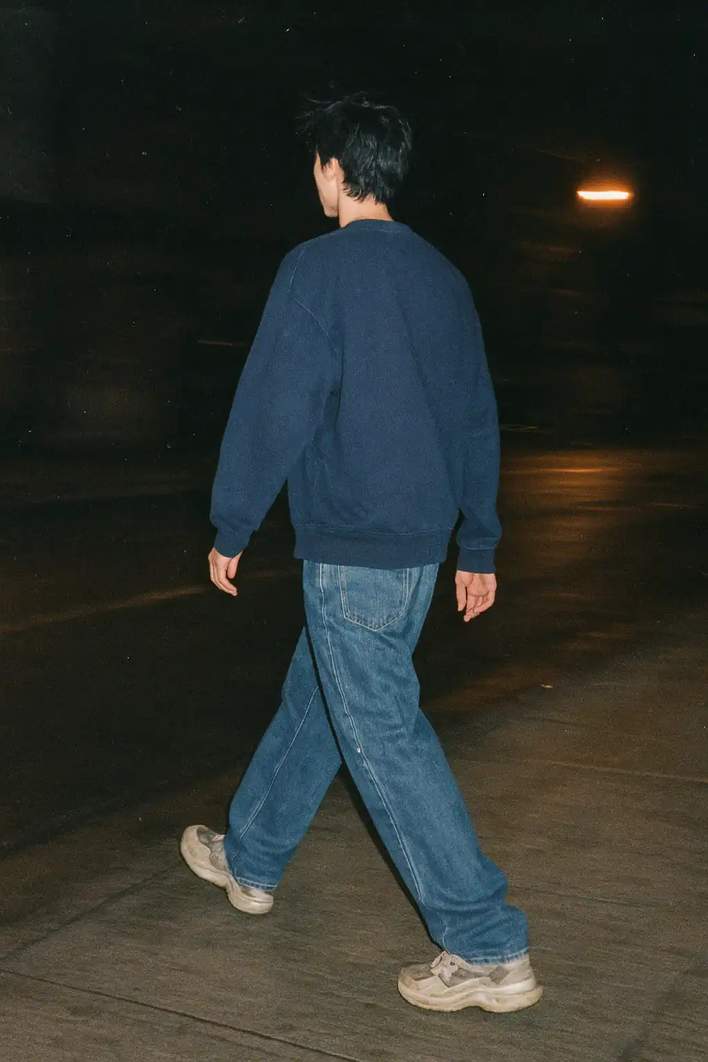 This Oversized Sweatshirt and Jeans AI mockup features a 27-year-old Caucasian Male model, Back-facing in a Walking Mid-Step against urban street at night, concrete pavement, streetlights, slightly wet ground reflecting light, gritty city environment, no studio setting. Built for Streetwear editorial brands and e-commerce product pages, this men clothing mockup delivers a realistic, print-ready result without a photoshoot, ideal for designers who need a professional AI model mockup fast.