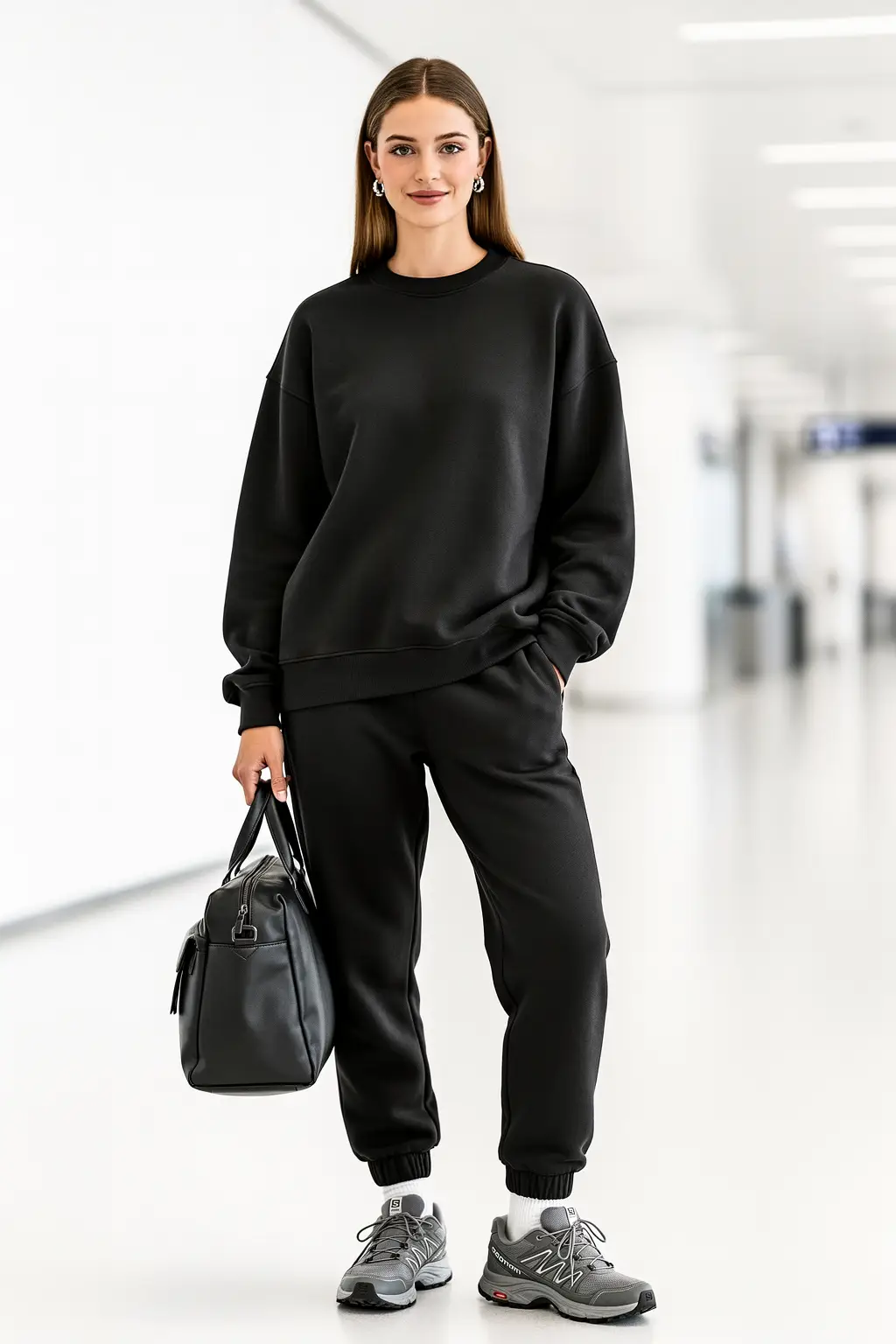 Oversized Sweatshirt and Sweatpants Mockup – women Studio lookbook, standing in airport terminal departure area