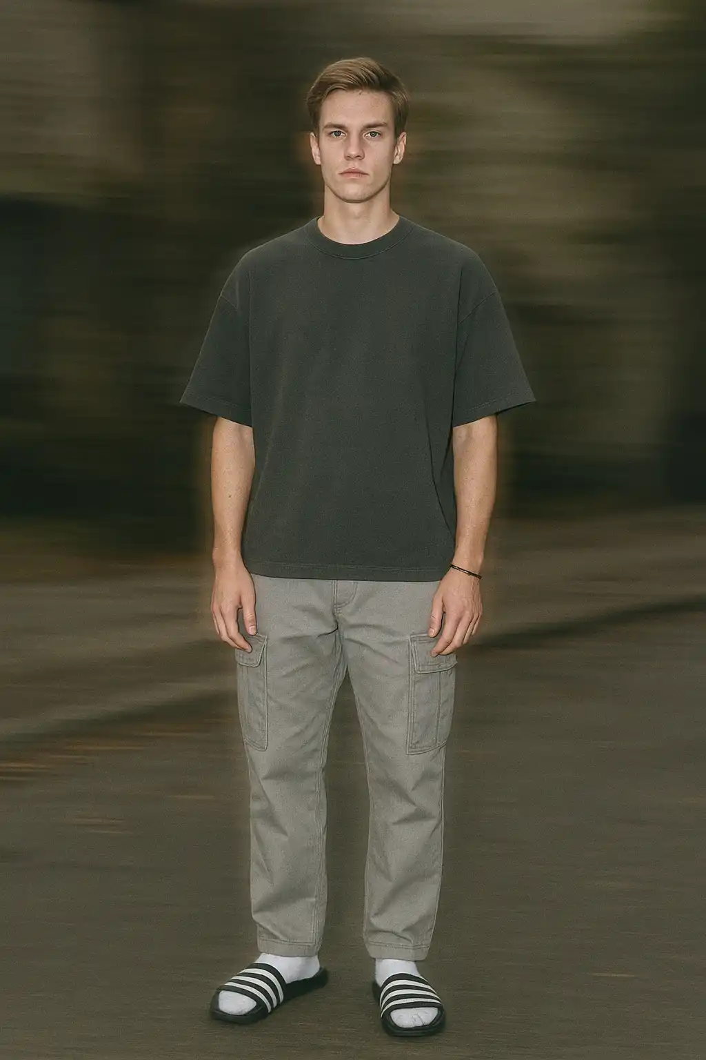 This Oversized T-Shirt and Cargo Pants AI mockup features a 21-year-old Caucasian Male model, Front-facing in a Symmetrical Standing Pose. Built for Candid brands and e-commerce product pages, this men clothing mockup delivers a realistic, print-ready result without a photoshoot, ideal for designers who need a professional AI model mockup fast.