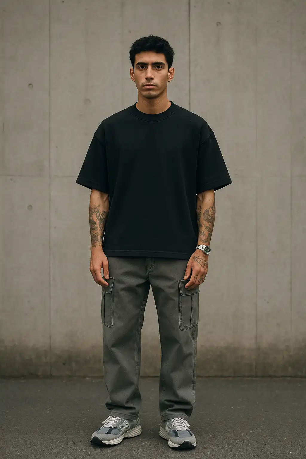 This Oversized T-Shirt and Cargo Pants AI mockup features a 21-year-old Middle Eastern Male model, Front-facing in a Symmetrical Standing Pose. Built for Streetwear editorial brands and e-commerce product pages, this men clothing mockup delivers a realistic, print-ready result without a photoshoot, ideal for designers who need a professional AI model mockup fast.