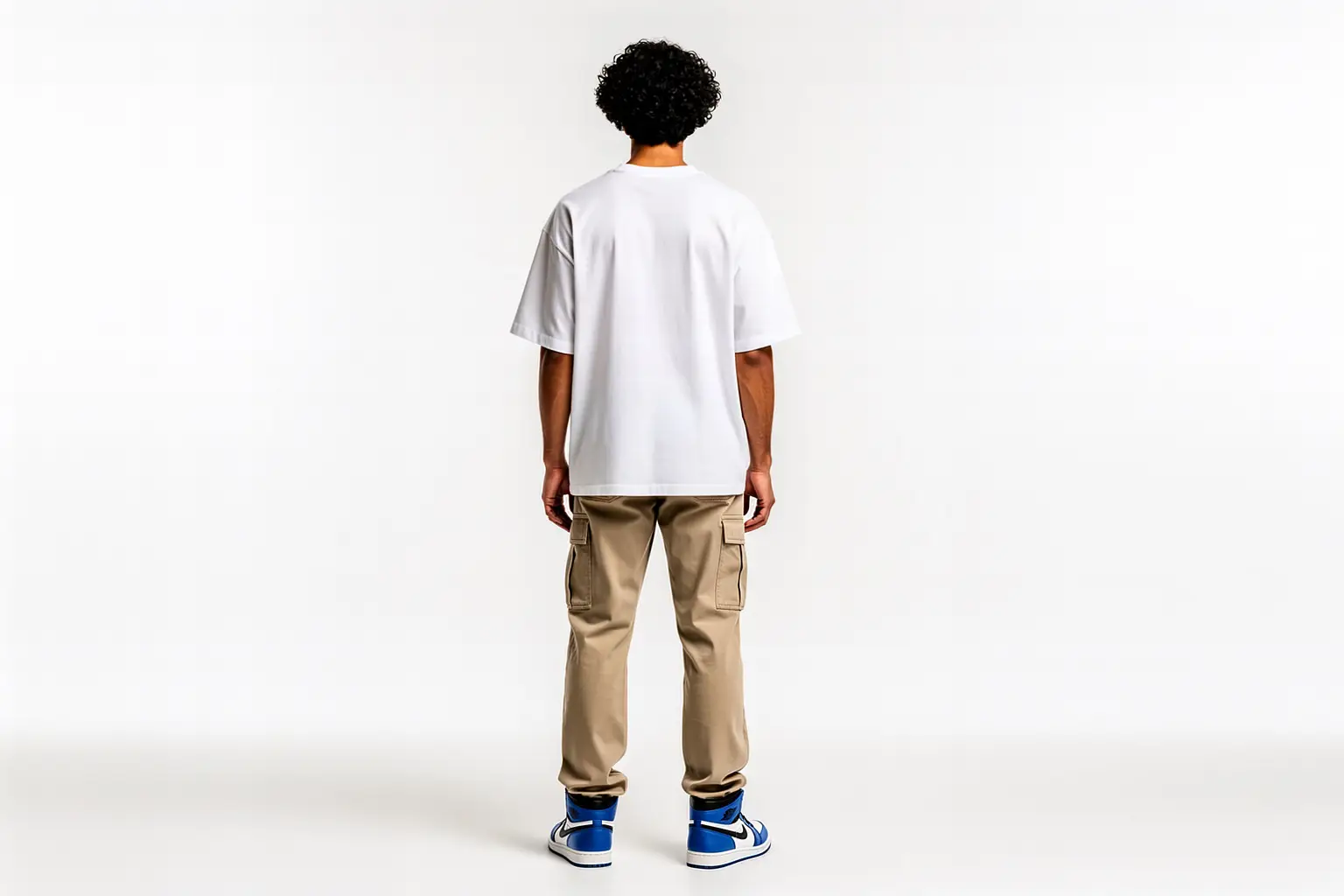 This Oversized T-Shirt and Cargo Pants AI mockup features a 21-year-old Middle Eastern Male model, Back-facing in a Symmetrical Standing Pose. Built for Studio lookbook brands and e-commerce product pages, this men clothing mockup delivers a realistic, print-ready result without a photoshoot, ideal for designers who need a professional AI model mockup fast.