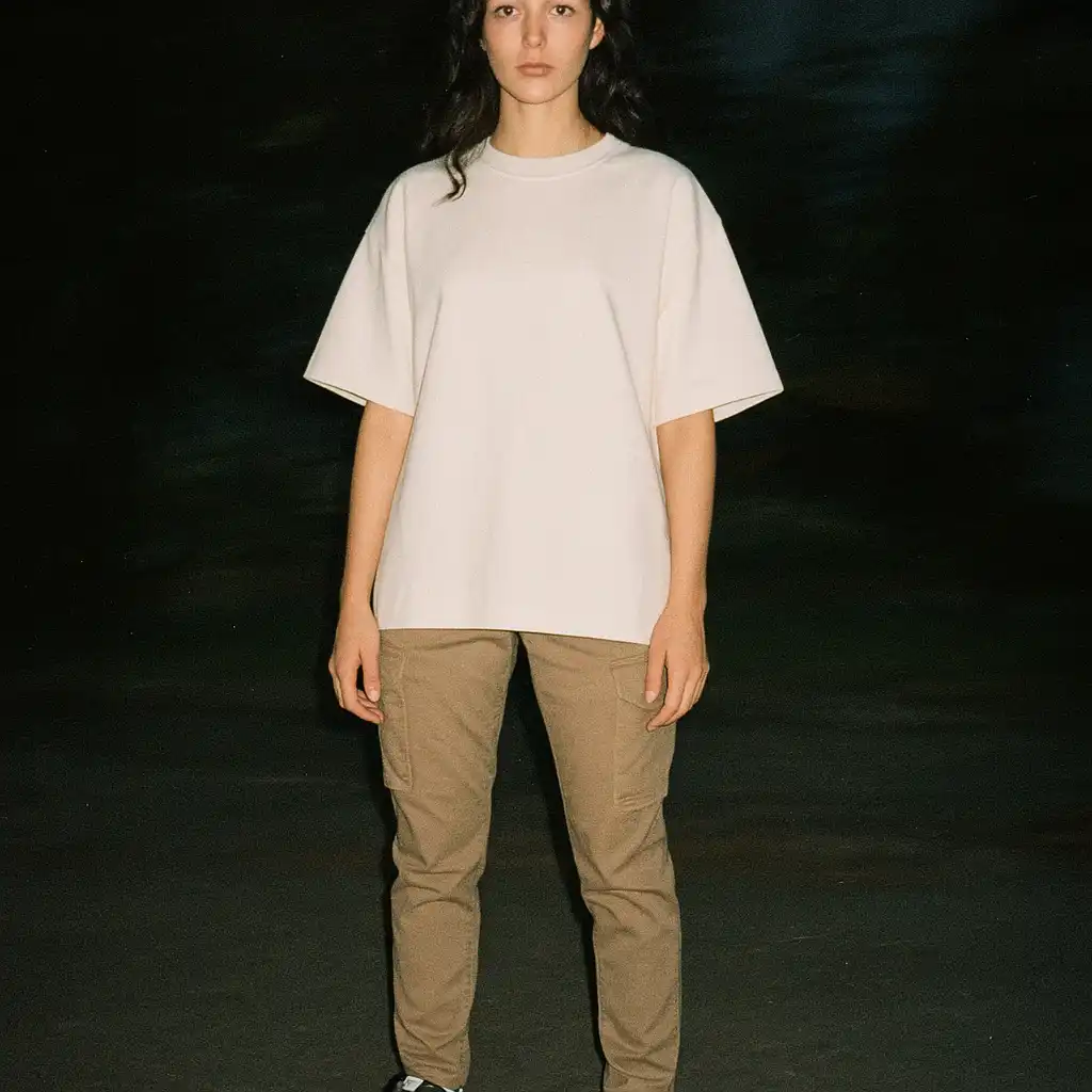 The Oversized fit showcases the drape and structure of the T-Shirt cleanly, with Cargo Pants rounding out a complete women Candid outfit. Shot in Candid style against outside, the high-contrast result works directly on Shopify product pages, Instagram posts, print-on-demand listings, and fashion lookbooks, no editing required.