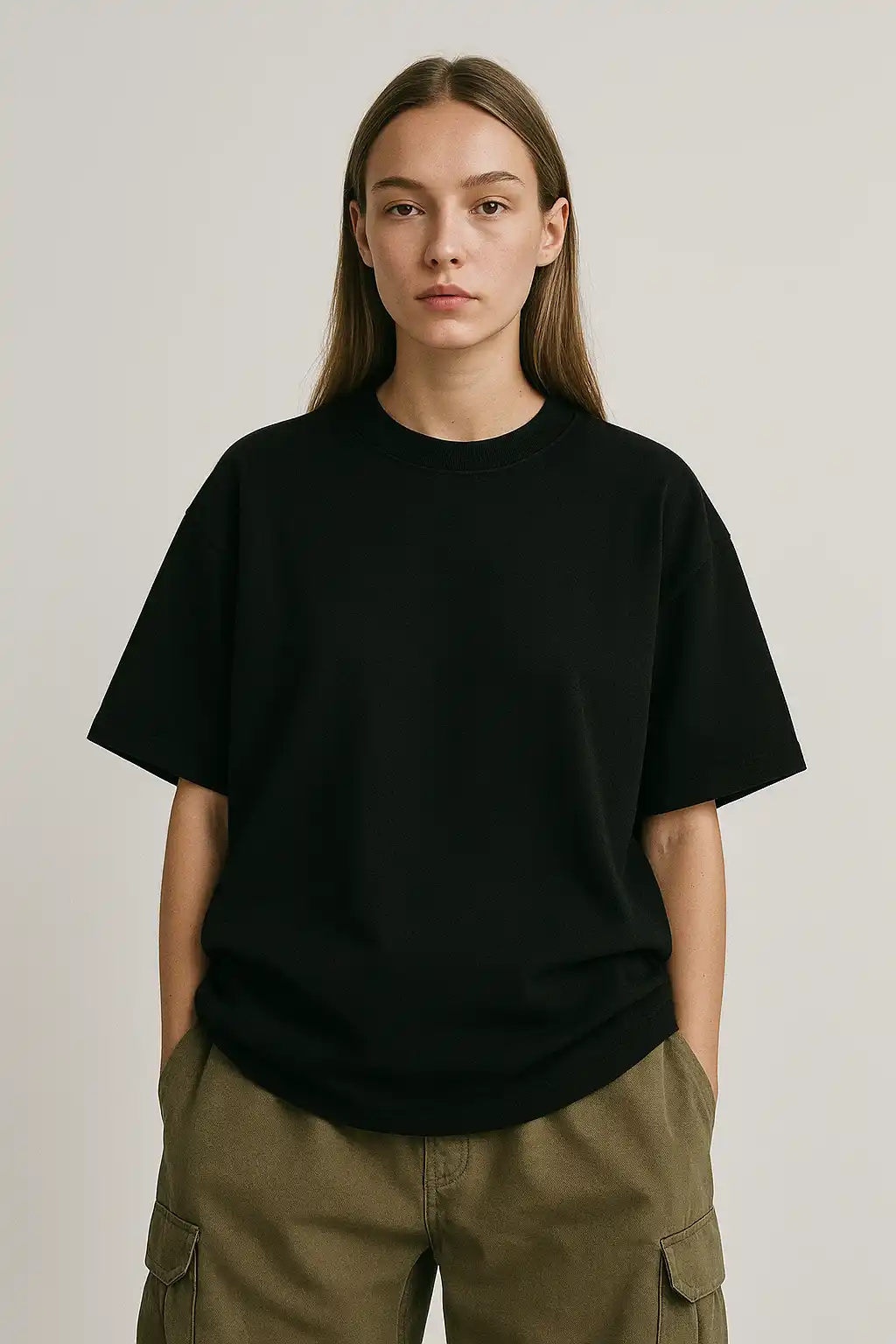 The Oversized fit showcases the drape and structure of the T-Shirt cleanly, with Cargo Pants rounding out a complete women Lifestyle outfit. Shot in Lifestyle style against seamless white backdrop, the high-contrast result works directly on Shopify product pages, Instagram posts, print-on-demand listings, and fashion lookbooks, no editing required.