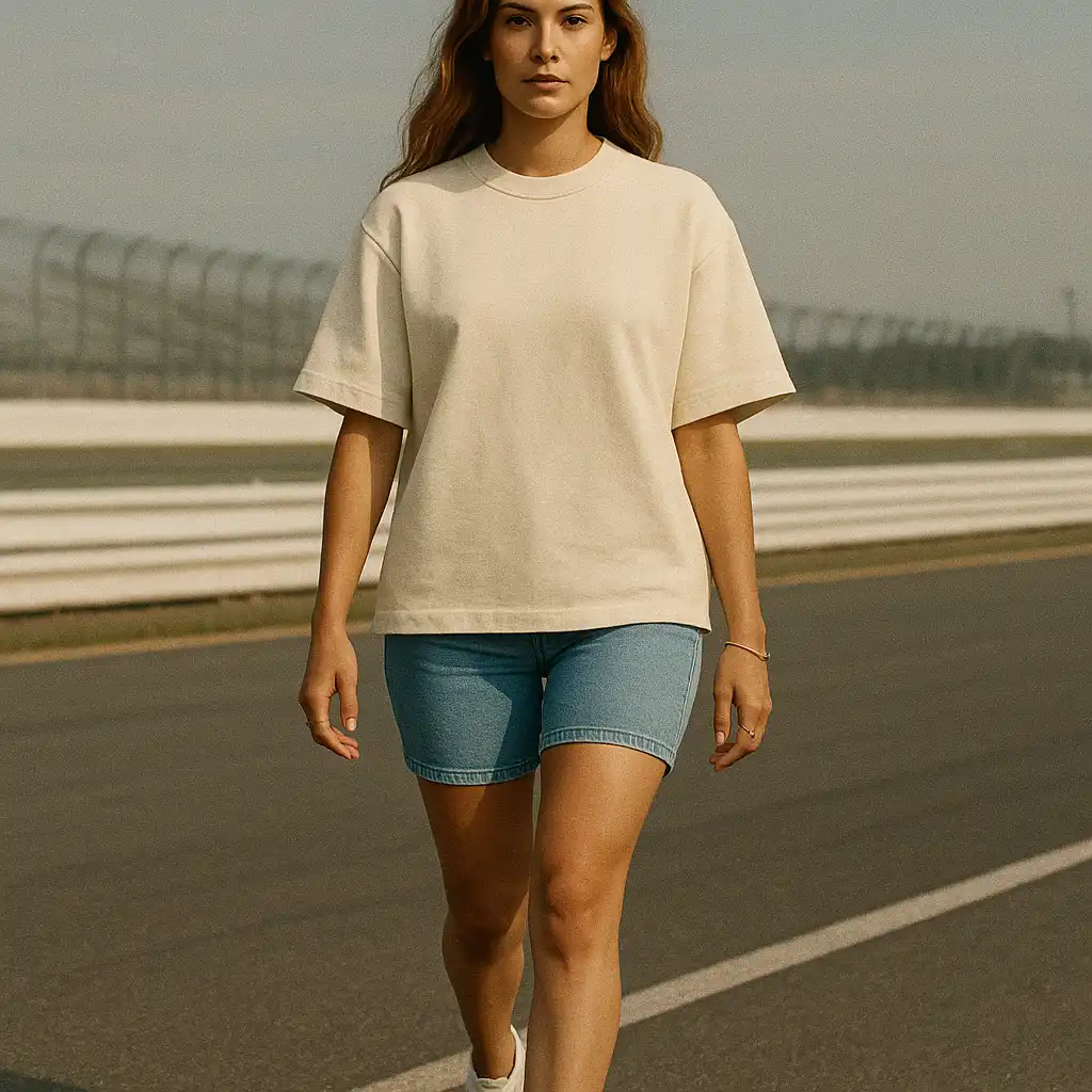 This Oversized T-Shirt and Jean Shorts AI mockup features a 22-year-old Hispanic Female model, Front-facing in a Walking Mid-Step against STANDING IN FRONT OF A RACETRACK. Built for Lifestyle brands and e-commerce product pages, this women clothing mockup delivers a realistic, print-ready result without a photoshoot, ideal for designers who need a professional AI model mockup fast.