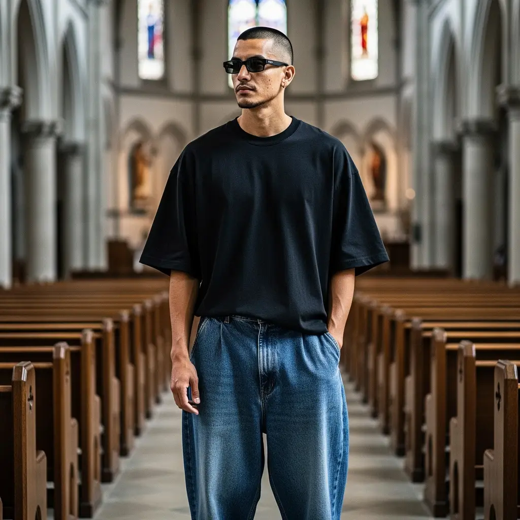 The Oversized fit showcases the drape and structure of the T-Shirt cleanly, with Jeans rounding out a complete men Streetwear editorial outfit. Shot in Streetwear editorial style against Standing in the middle of the aisle in a church, the high-contrast result works directly on Shopify product pages, Instagram posts, print-on-demand listings, and fashion lookbooks, no editing required.