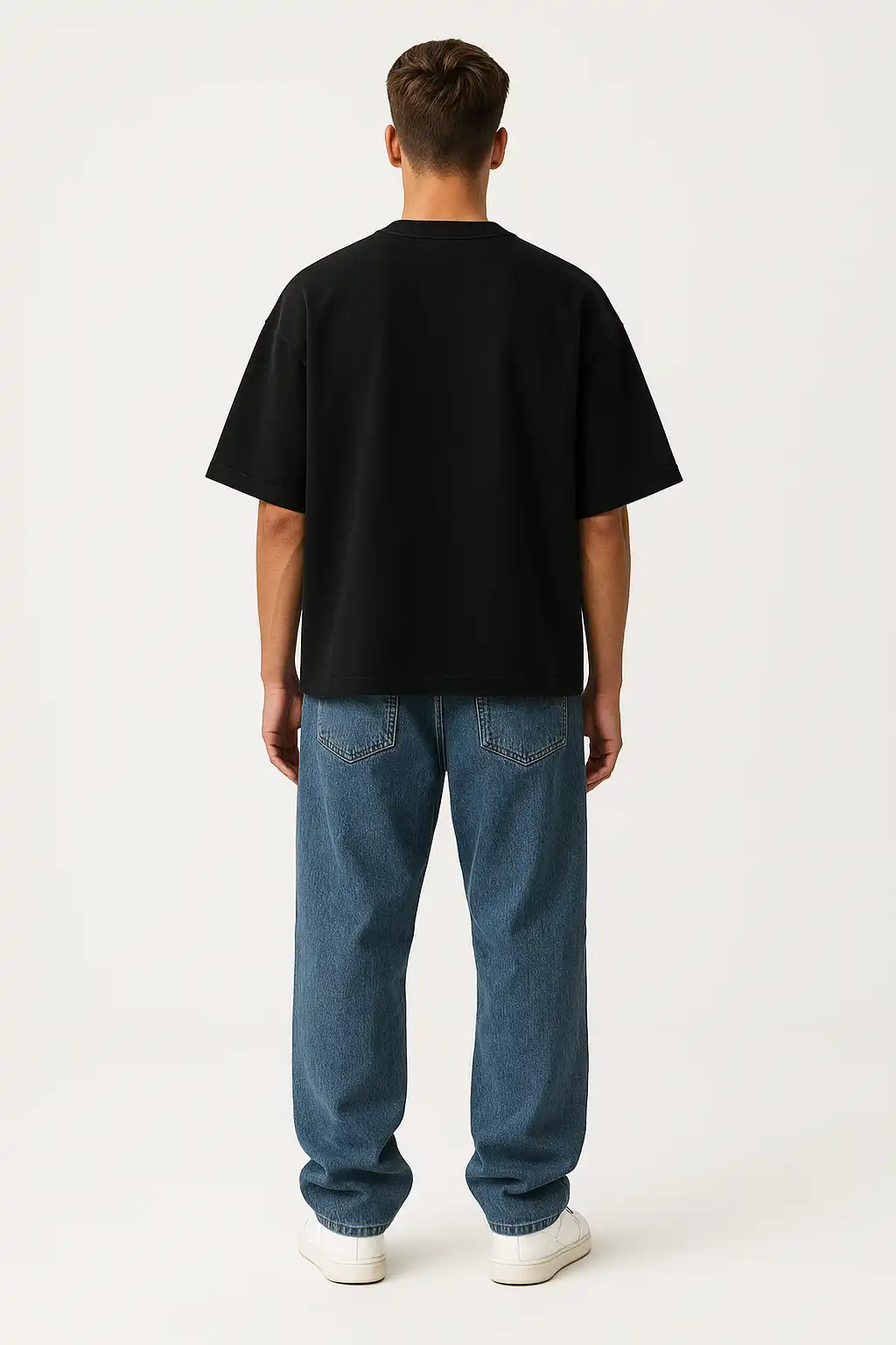 This Oversized T-Shirt and Jeans AI mockup features a 25-year-old Middle Eastern Male model, Back-facing in a Symmetrical Standing Pose against solid white studio background. Built for Studio lookbook brands and e-commerce product pages, this men clothing mockup delivers a realistic, print-ready result without a photoshoot, ideal for designers who need a professional AI model mockup fast.