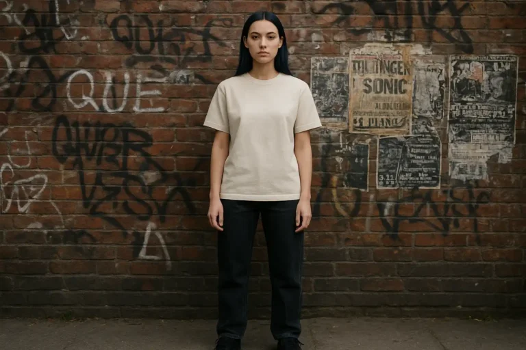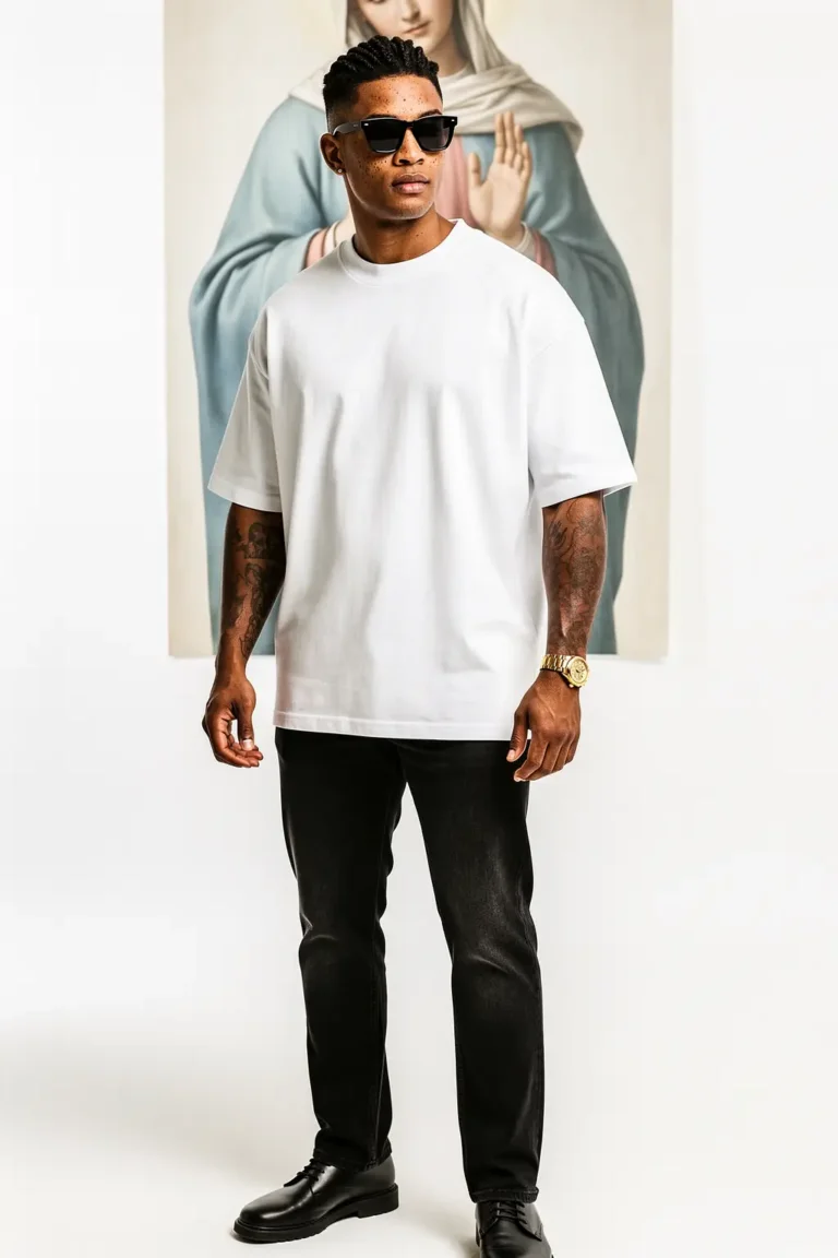 The Oversized fit showcases the drape and structure of the T-Shirt cleanly, with Jeans rounding out a complete men Studio lookbook outfit. Shot in Studio lookbook style against white background, the high-contrast result works directly on Shopify product pages, Instagram posts, print-on-demand listings, and fashion lookbooks, no editing required.