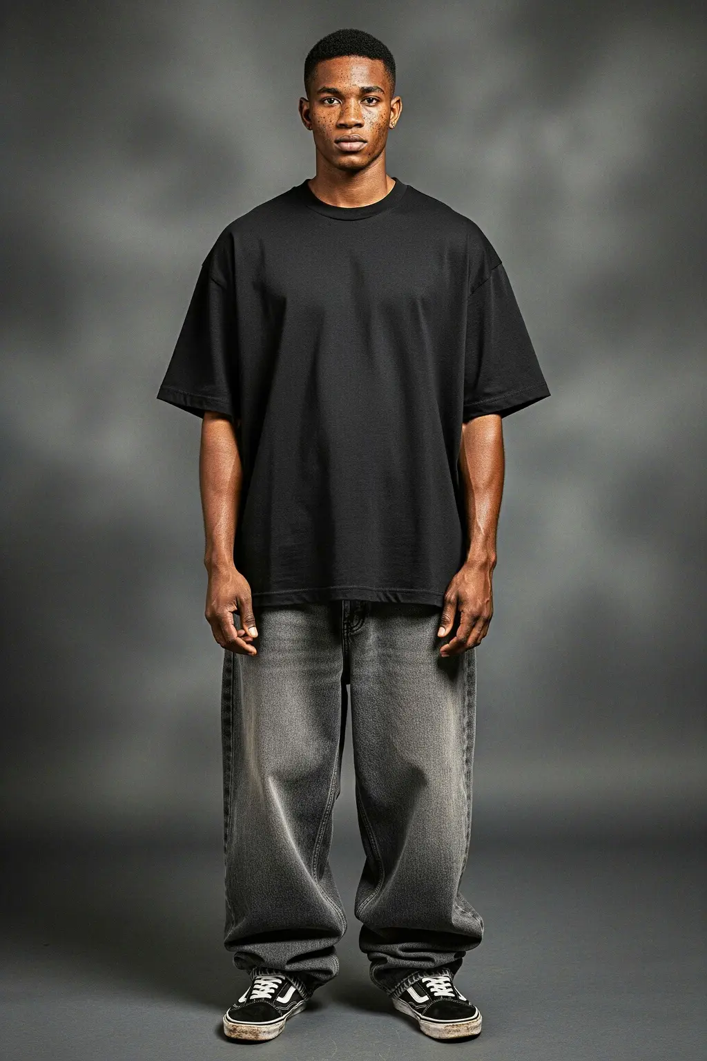 This Oversized T-Shirt and Jeans AI mockup features a 22-year-old African Male model, Front-facing in a Symmetrical Standing Pose against white background. Built for Studio lookbook brands and e-commerce product pages, this men clothing mockup delivers a realistic, print-ready result without a photoshoot, ideal for designers who need a professional AI model mockup fast.