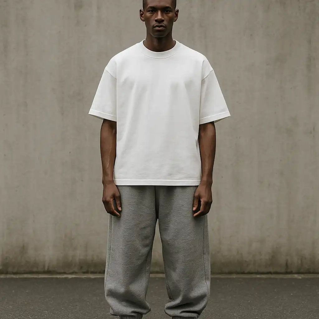 The Oversized fit showcases the drape and structure of the T-Shirt cleanly, with Sweatpants rounding out a complete men Streetwear editorial outfit. Shot in Streetwear editorial style, the high-contrast result works directly on Shopify product pages, Instagram posts, print-on-demand listings, and fashion lookbooks, no editing required.