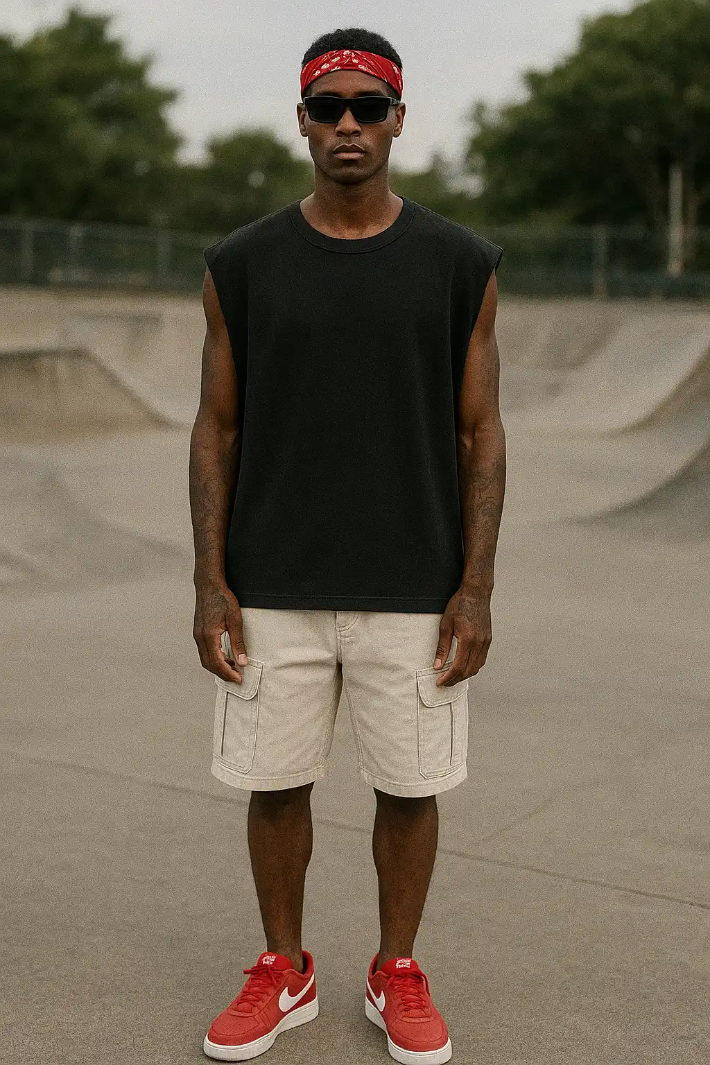 The Oversized fit showcases the drape and structure of the Tank Top cleanly, with Cargo Shorts rounding out a complete men Streetwear editorial outfit. Shot in Streetwear editorial style against standing in the skate park, the high-contrast result works directly on Shopify product pages, Instagram posts, print-on-demand listings, and fashion lookbooks, no editing required.