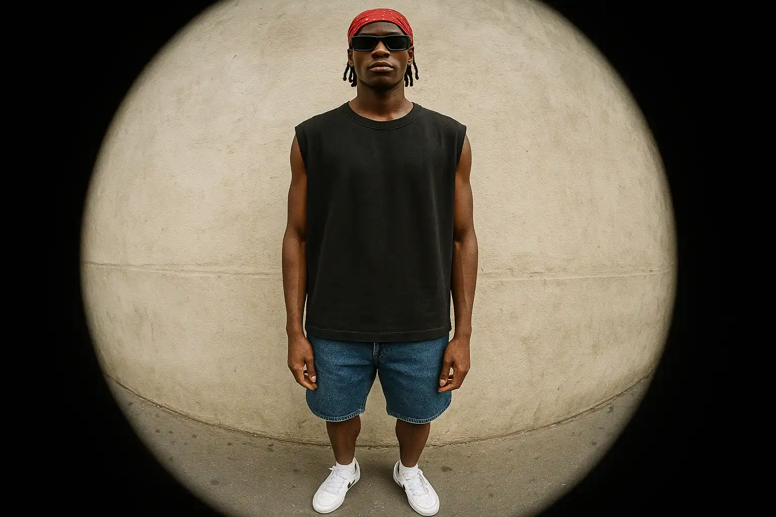 This Oversized Tank Top and Jean Shorts AI mockup features a 22-year-old African Male model, Front-facing in a Symmetrical Standing Pose. Built for Lifestyle brands and e-commerce product pages, this men clothing mockup delivers a realistic, print-ready result without a photoshoot, ideal for designers who need a professional AI model mockup fast.