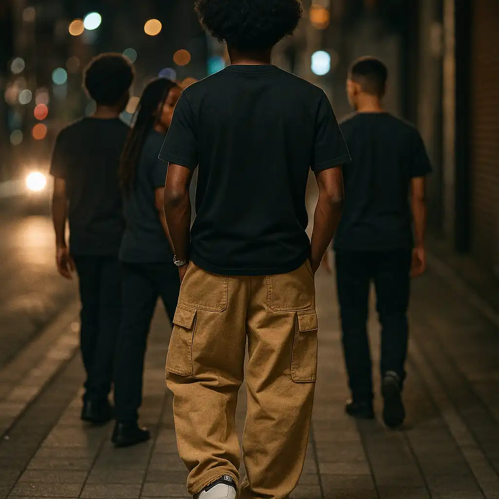 This Regular T-Shirt and Cargo Pants AI mockup features a 32-year-old African Male model, Back-facing in a Hands in Pockets – Standing Relaxed against walking away from the camera down a side walk at night. with a group of 3 people walking just in front of him. One of the people in the group is a black man with an afro, another is a black girl with dread locks and the last person has a low fade hair cut. the black girl with dread locks is looking back at the main model. There are very bright headlights in the background that backlights the models.. Built for Streetwear editorial brands and e-commerce product pages, this men clothing mockup delivers a realistic, print-ready result without a photoshoot, ideal for designers who need a professional AI model mockup fast.
