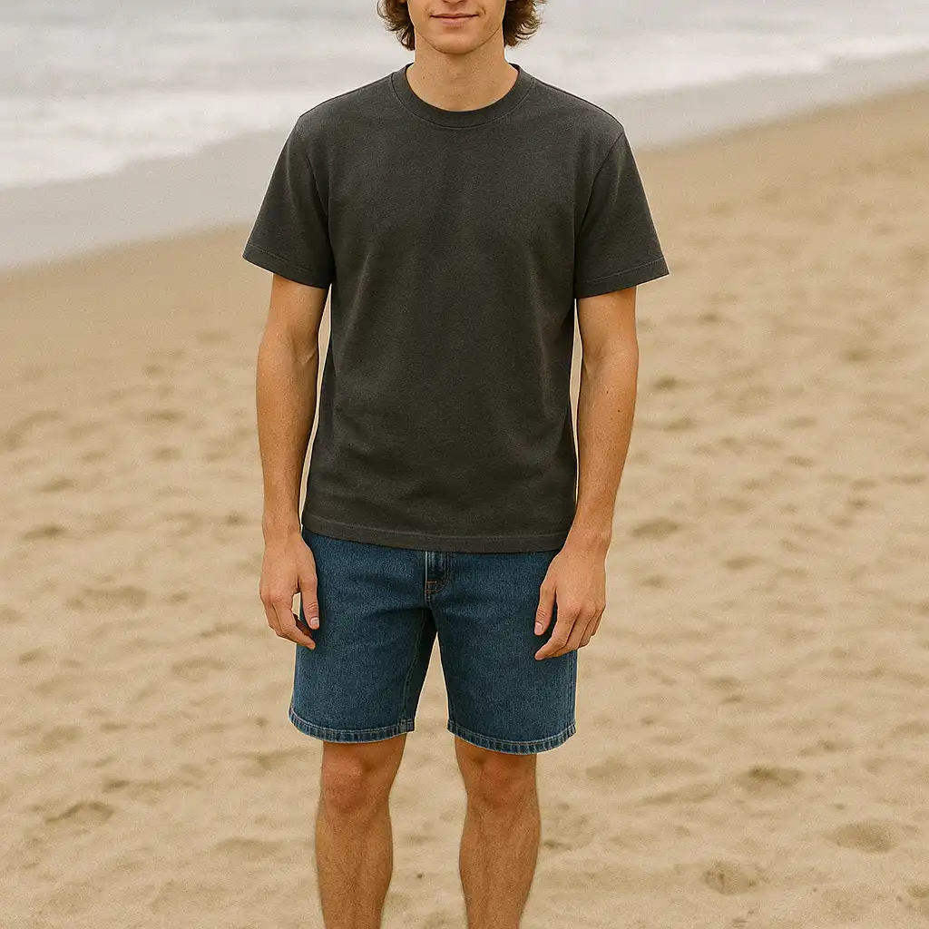 The Regular fit showcases the drape and structure of the T-Shirt cleanly, with Jean Shorts rounding out a complete men Lifestyle outfit. Shot in Lifestyle style against beach sandy background, the high-contrast result works directly on Shopify product pages, Instagram posts, print-on-demand listings, and fashion lookbooks, no editing required.