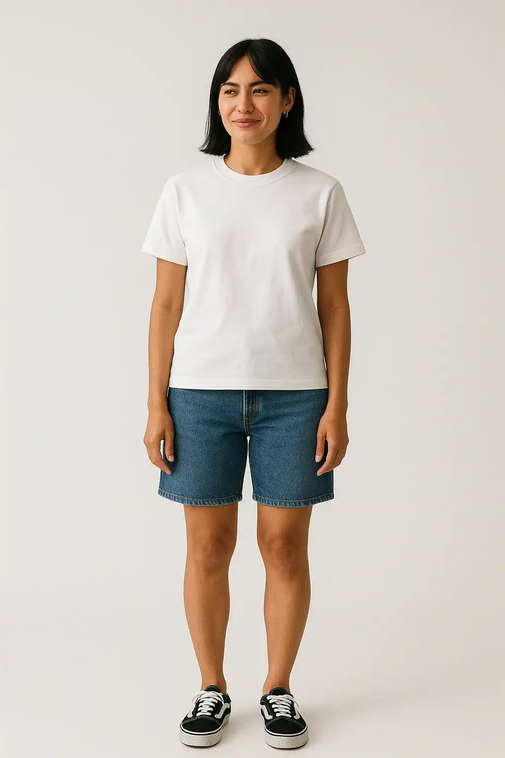 This Regular T-Shirt and Jean Shorts AI mockup features a 25-year-old Hispanic Female model, Front-facing in a Symmetrical Standing Pose. Built for Studio lookbook brands and e-commerce product pages, this women clothing mockup delivers a realistic, print-ready result without a photoshoot, ideal for designers who need a professional AI model mockup fast.