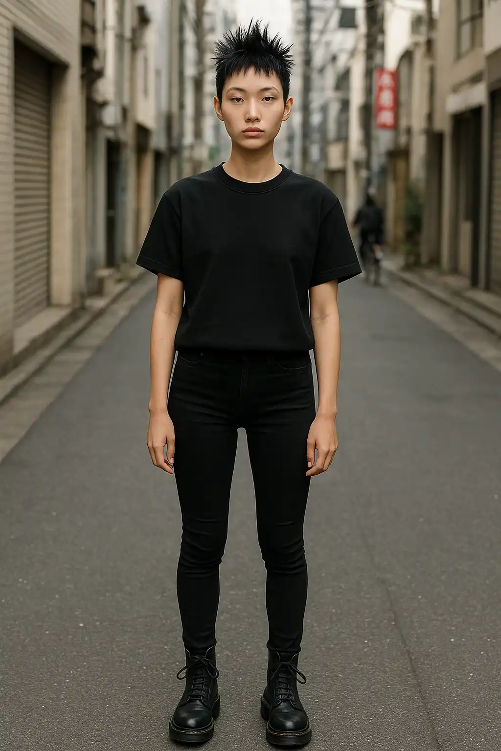 This Regular T-Shirt and Jeans AI mockup features a 18-year-old Asian Female model, Front-facing in a Symmetrical Standing Pose against Tokyo. Built for Streetwear editorial brands and e-commerce product pages, this women clothing mockup delivers a realistic, print-ready result without a photoshoot, ideal for designers who need a professional AI model mockup fast.
