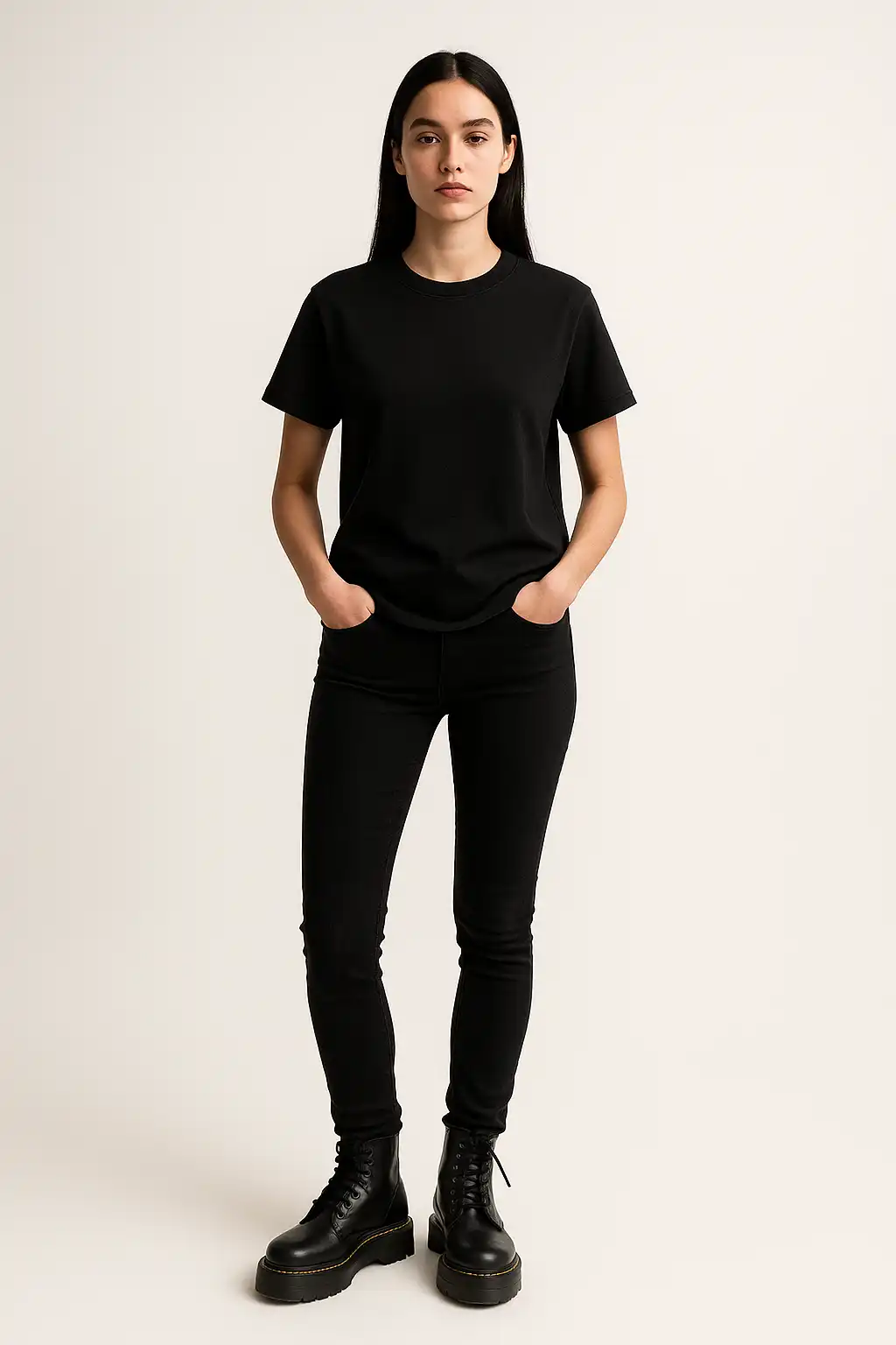 The Regular fit showcases the drape and structure of the T-Shirt cleanly, with Jeans rounding out a complete women Studio lookbook outfit. Shot in Studio lookbook style against white background in a photo studio, the high-contrast result works directly on Shopify product pages, Instagram posts, print-on-demand listings, and fashion lookbooks, no editing required.