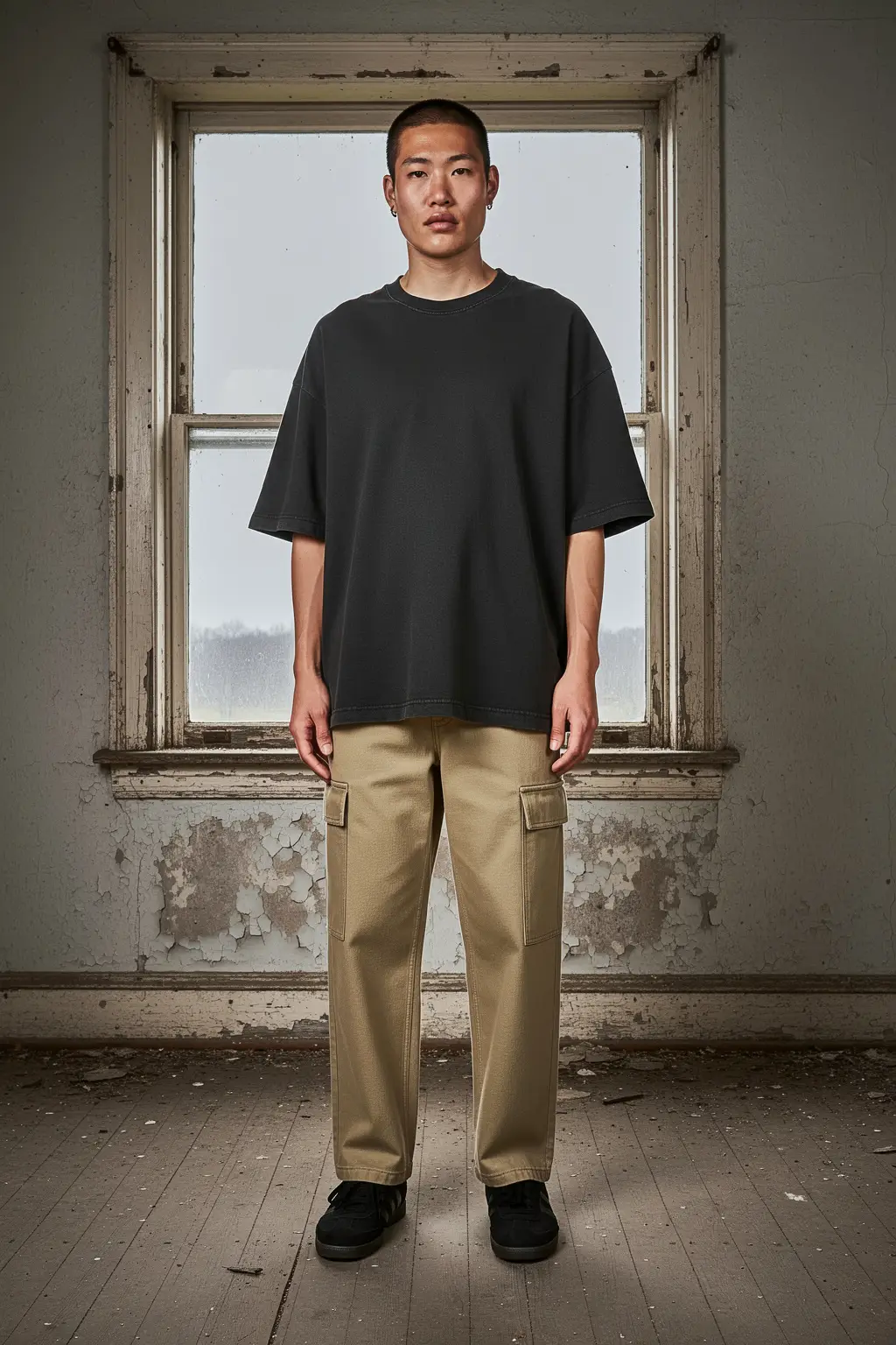 The fit showcases the drape and structure of the T-Shirt cleanly, with Cargo Pants rounding out a complete men Streetwear editorial outfit. Shot in Streetwear editorial style, the high-contrast result works directly on Shopify product pages, Instagram posts, print-on-demand listings, and fashion lookbooks, no editing required.