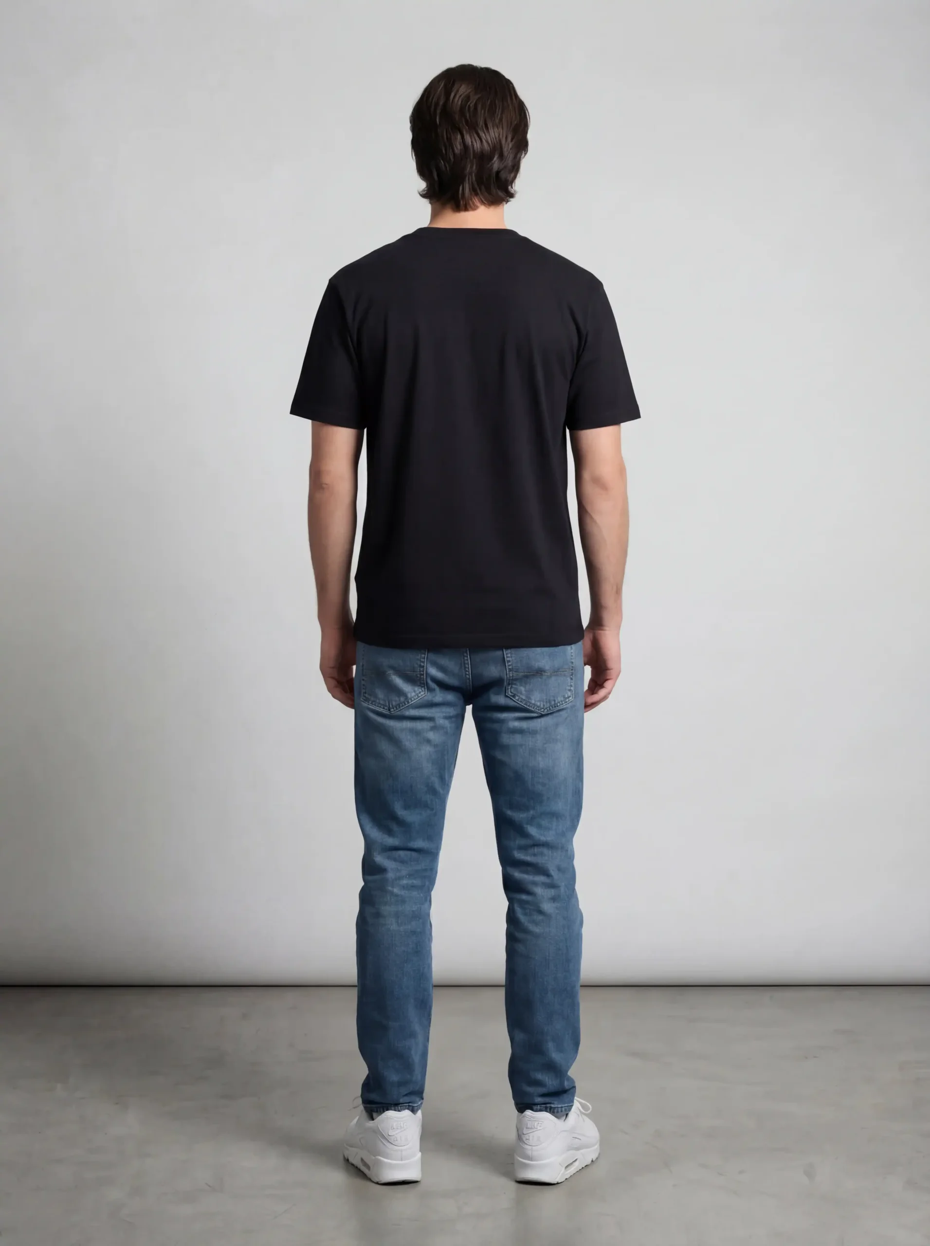 The fit showcases the drape and structure of the T-Shirt cleanly, with Jeans rounding out a complete men Studio lookbook outfit. Shot in Studio lookbook style, the high-contrast result works directly on Shopify product pages, Instagram posts, print-on-demand listings, and fashion lookbooks, no editing required.