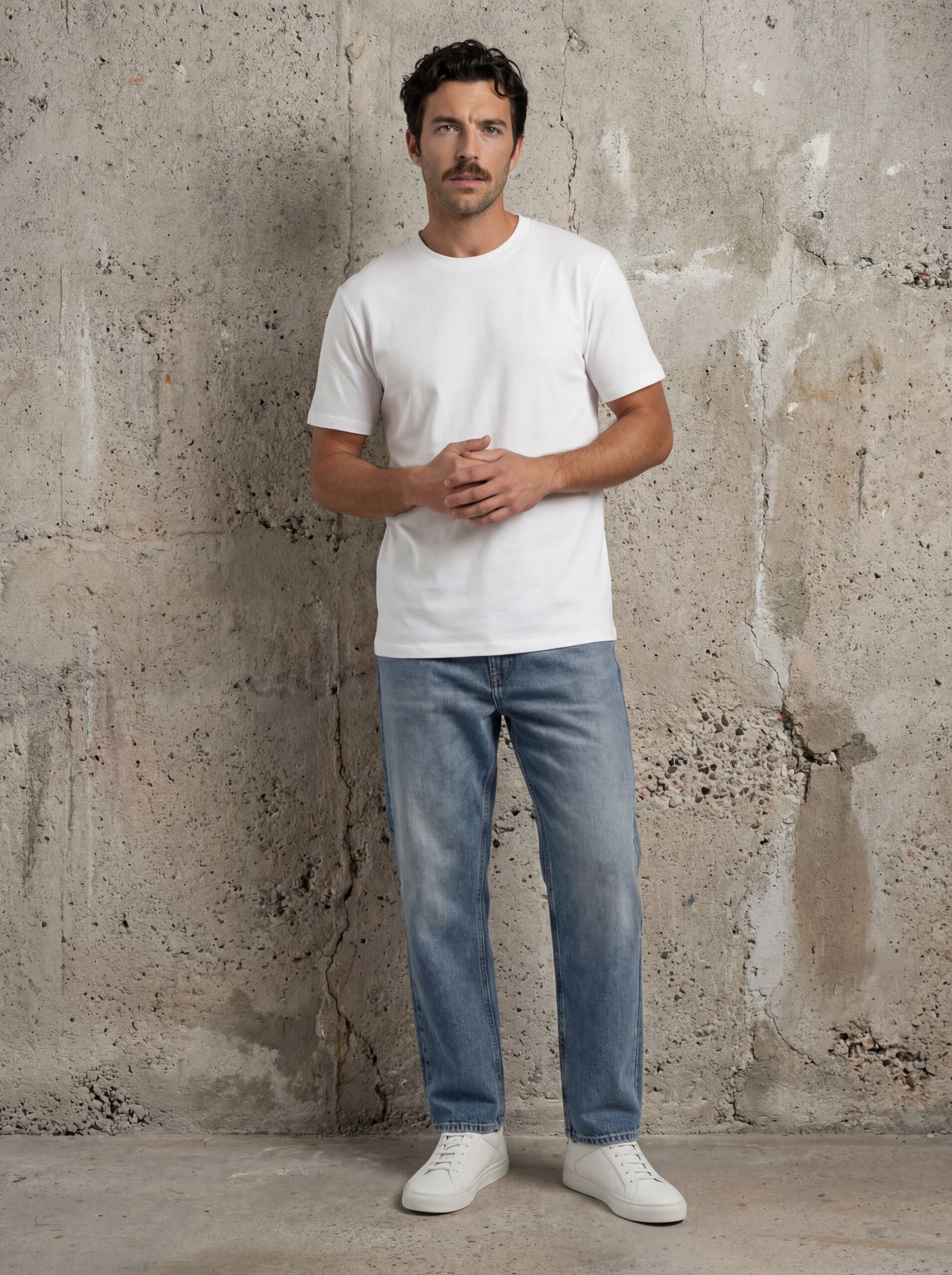 The fit showcases the drape and structure of the T-Shirt cleanly, with Jeans rounding out a complete men Studio lookbook outfit. Shot in Studio lookbook style, the high-contrast result works directly on Shopify product pages, Instagram posts, print-on-demand listings, and fashion lookbooks, no editing required.
