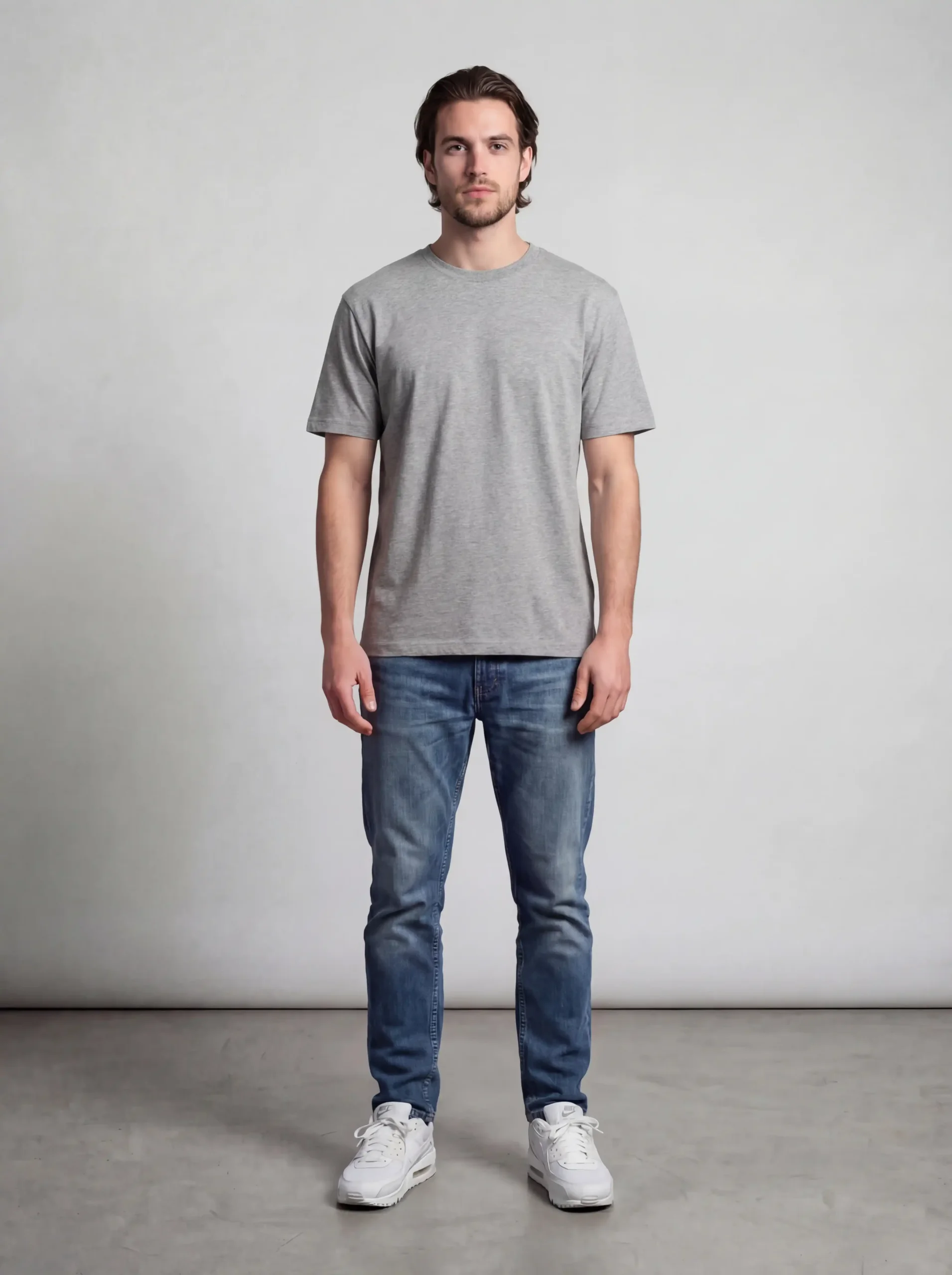 This T-Shirt and Jeans AI mockup features a Male model. Built for Studio lookbook brands and e-commerce product pages, this men clothing mockup delivers a realistic, print-ready result without a photoshoot, ideal for designers who need a professional AI model mockup fast.