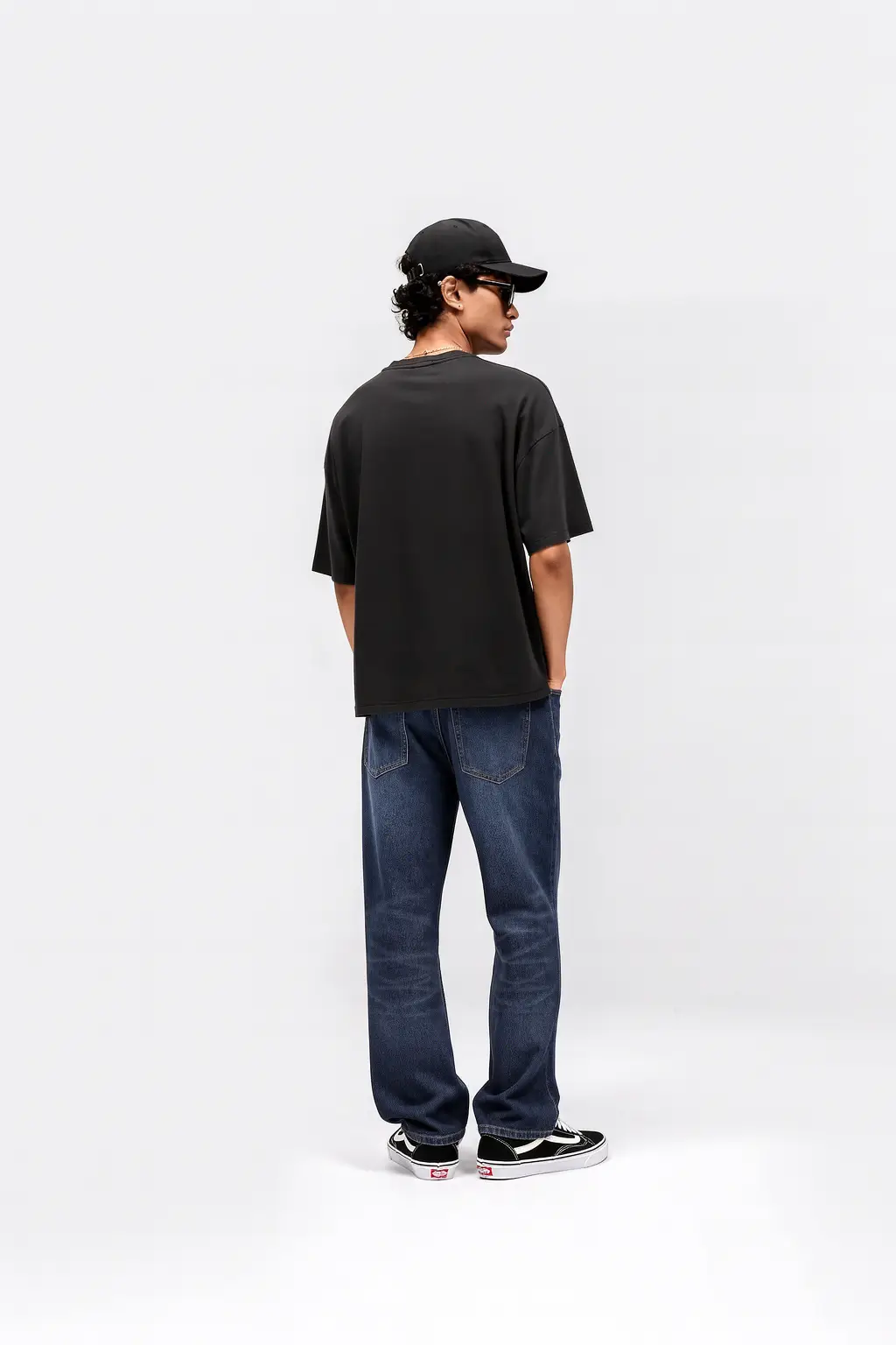 The fit showcases the drape and structure of the T-Shirt cleanly, with Jeans rounding out a complete men Studio lookbook outfit. Shot in Studio lookbook style, the high-contrast result works directly on Shopify product pages, Instagram posts, print-on-demand listings, and fashion lookbooks, no editing required.